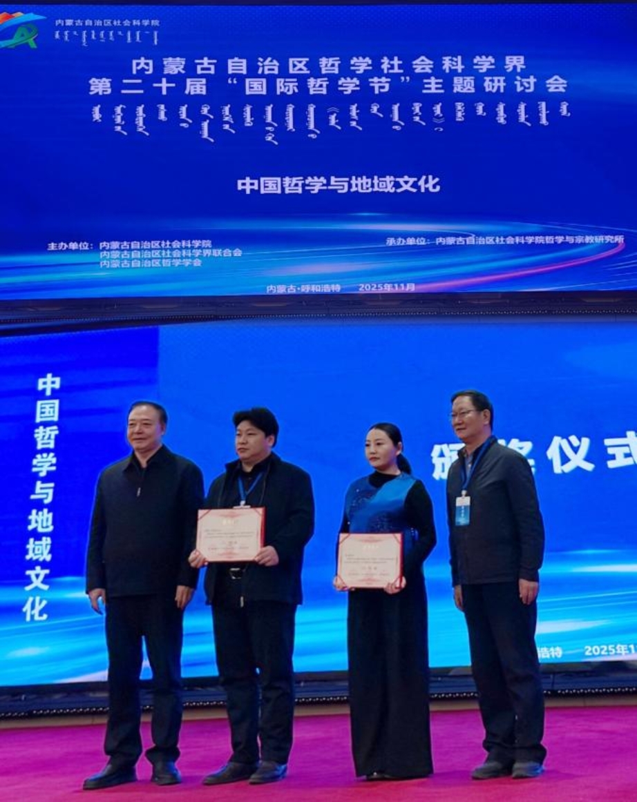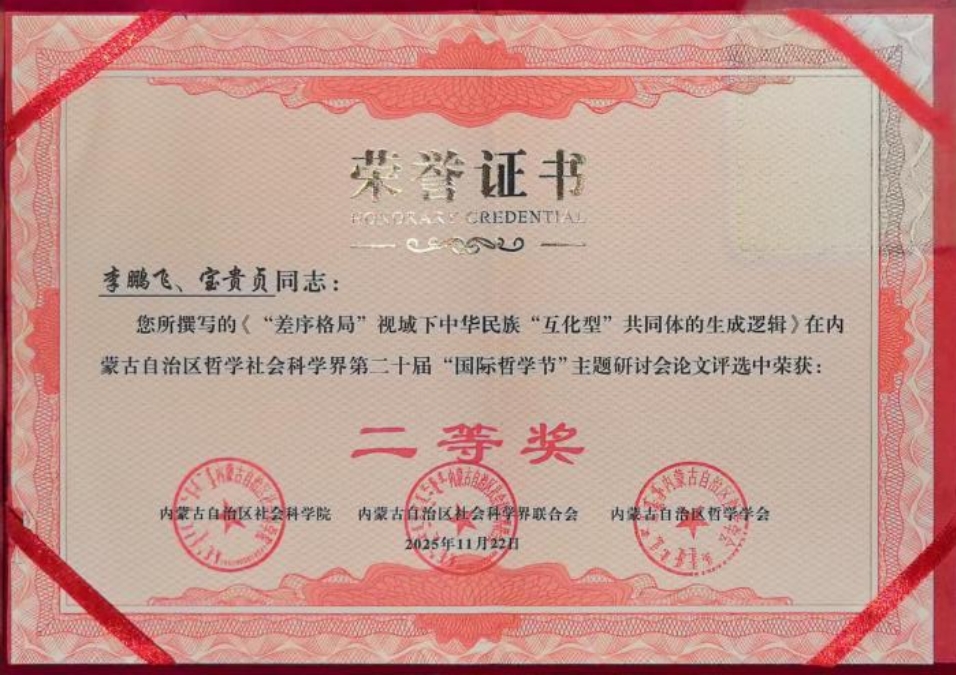 “国际哲学节”(世界哲学日)是由联合国教科文组织倡导发起的重要国际性学术纪念活动,旨在推动哲学思考走进公众,促进跨文化交流。内蒙古自治区哲学社会科学界连续二十年举办相关主题研讨会,已形成显著的社会影响力与品牌效应。本届研讨会投稿数量多、来源广、质量高,经专家严格评审,最终入围45篇,并评出一等奖2篇、二等奖5篇、三等奖10篇。李鹏飞老师的论文能够在与国内顶尖高校和科研机构学者的同台竞技中荣获二等奖,充分体现了其扎实的学术研究能力、独特的理论视角以及我校在人文社科领域不断提升的科研实力。