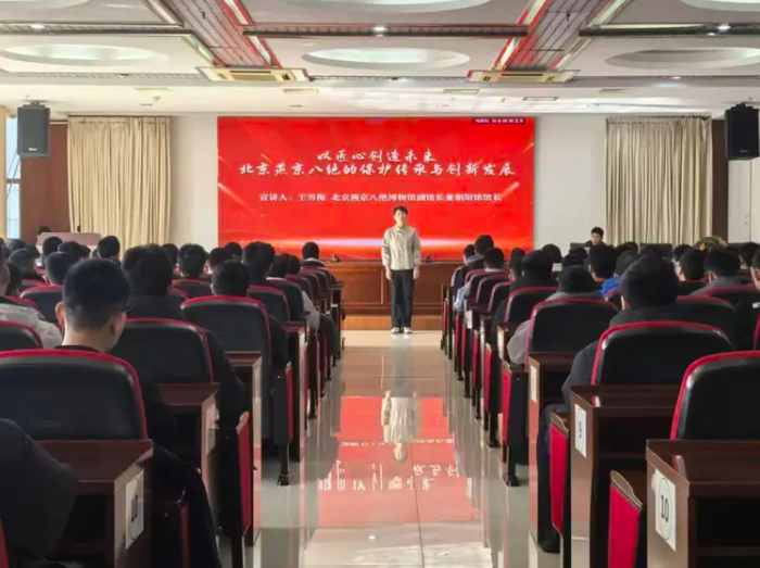 宣讲开始,北京燕京八绝博物馆副馆长兼朝阳馆馆长王雪梅率先登台,以《以匠心创造未来——北京燕京八绝的保护传承与创新发展》为题,深情讲述了国家级非物质文化遗产的传承之路。这位退役军人出身的文化传播者,结合参与北京燕京八绝博物馆、北京金漆镶嵌艺术博物馆两座场馆的筹建与运营经历,分享了组织百余场文化活动的幕后故事,尤其提及接待中外贵宾时的专业讲解经历,让师生深刻感受到传统文化“走出去”的自豪与荣光。她用“匠心守艺、创新传韵”的实践,诠释了非遗传承与退役军人担当的双重使命。