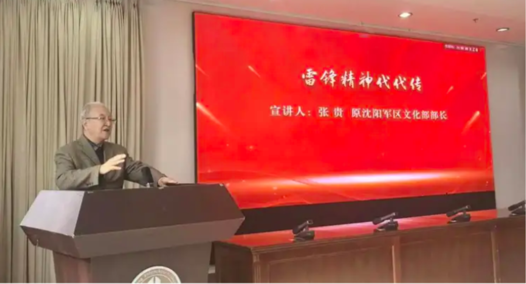 活动尾声,原沈阳军区文化部部长张贵的宣讲将氛围推向高潮。这位头发花白却精神矍铄的老者,作为雷锋的同期战友,以《雷锋精神代代传》为题,用亲身经历还原了雷锋同志的鲜活形象。他追忆与雷锋并肩奋斗的岁月,解读“螺丝钉精神”的时代内涵,分享数十年走进校园、社区宣讲的坚守初心。“雷锋精神不是过时的传说,而是永恒的追求”,质朴而有力的话语,让现场师生深受触动,纷纷表示要将雷锋精神融入日常学习生活。